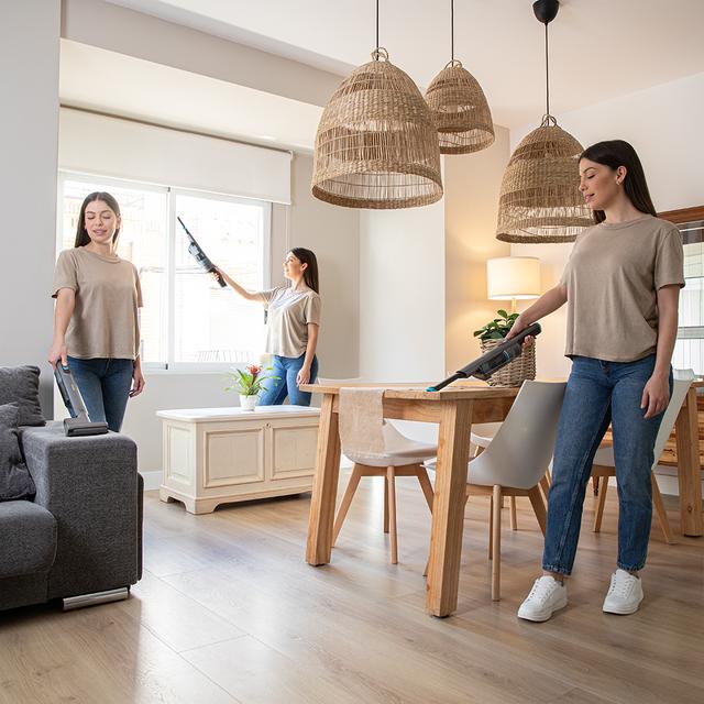 - Sistema Battery 16,8 V con una batería extraíble de Ion-Litio de 2500 mAh y 16,8 V que consigue una autonomía de hasta 40 minutos.* Incluye un accesorio para tapicerías, un accesorio 2en1 para muebles y/o esquinas y una base de carga.