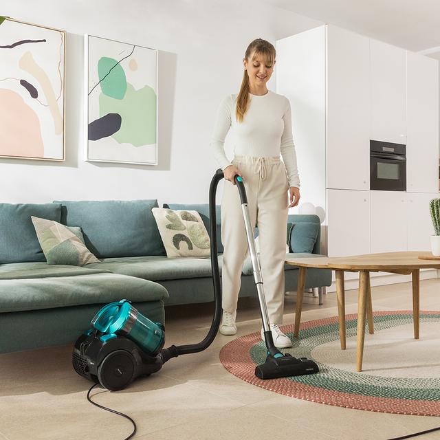 - Aspirador sin bolsas multiciclónico: máxima potencia, mínimo consumo y una gran capacidad de filtración.