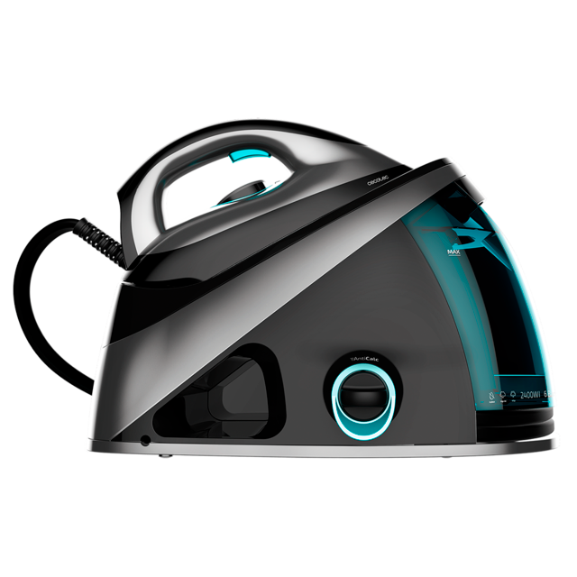 Centro de planchado 2400 W. Golpe de vapor de 480 g/min y 145 g/min. 6 bares. Suela Turbo Slide. Filtro antical de varilla descalcificadora Pro Clean. Seguridad contra sobrecalentamientos.