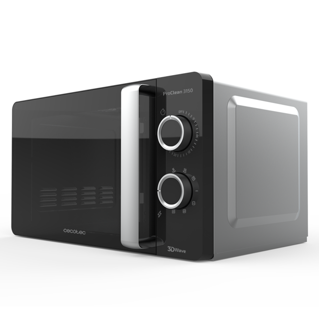 Microondas plateado con Grill y Revestimiento Ready2Clean para una mejor Limpieza, Tecnología 3DWave, input 1150 W, output 700 W y Grill 800 W, 20 l. Diseño elegante con puerta FullCrystal, 6 niveles, ProClean 3150 de Cecotec.