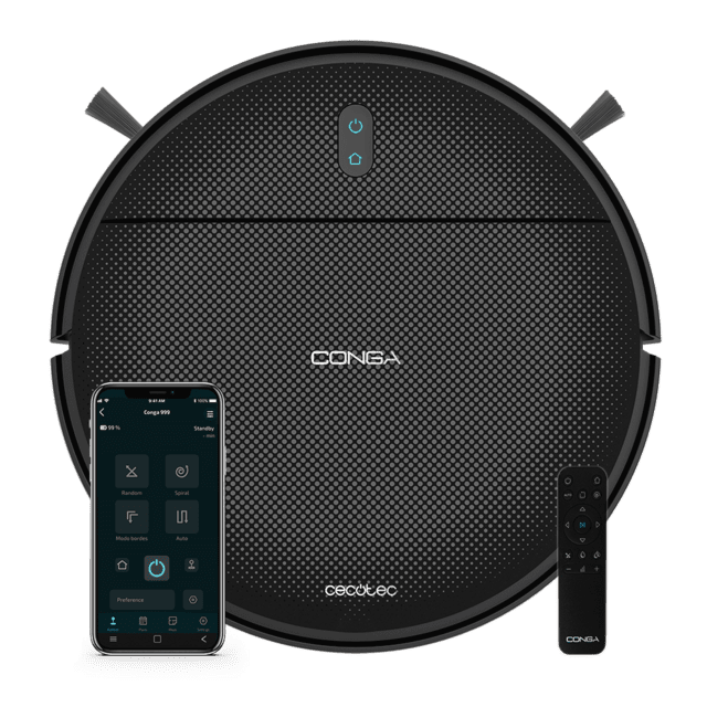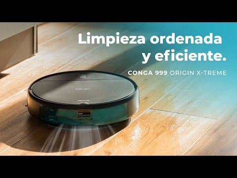 Robot aspirador Conga 999 Origin Genesis con navegación reactiva para una limpieza total de la casa. Gran boca de succión con potencia de 1400 Pa de motor. 2 cepillos laterales. Autonomía de 120 minutos.