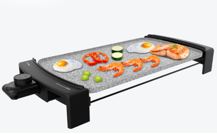 Plancha de asar eléctrica de gran potencia con 2600 W, revestimiento de piedra RockStone, resistencia en M, termostato regulable y apta para lavavajillas.